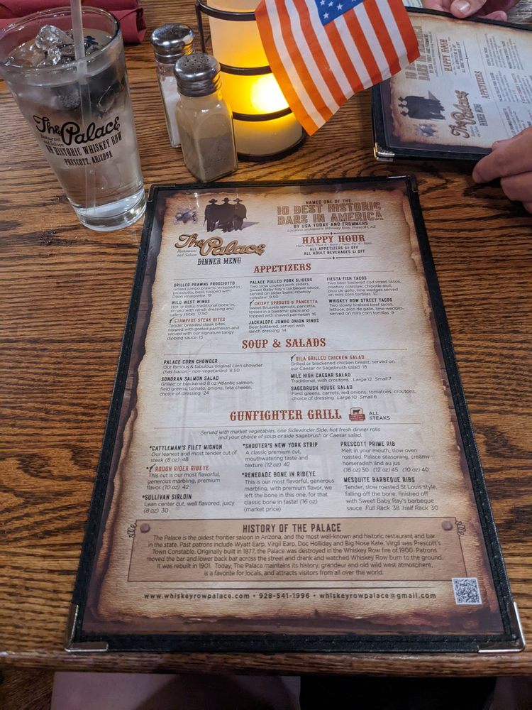 Palace Restaurant & Saloon, located in Prescott, AZ, is a historic bar and restaurant offering a unique and memorable dining experience. The menu boasts a variety of options, from Bonner's Roast Prime Rib to Fresh Citrus Atlantic Salmon, catering to both meat lovers and seafood enthusiasts. Customers praise the quality of the meals, with steaks rivaling those of fancier steakhouses. The atmosphere is rich in history, with staff dressed in period costumes, live music, and a cozy ambiance. From the attentive service to the diverse menu choices, Palace Restaurant & Saloon is a must-visit destination in Prescott for a taste of the past combined with excellent dining options.